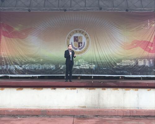 随后,经济管理系党支部书记覃文进作了讲话。覃书记说,2019年是我国和我校发展的重要一年,内容涵盖:建国70周年的发展、两会进行时的重要信息、我校升本改大的关键冲刺要求、概括总结了学校2018年事业发展取得的各项成绩以及对同学们新学期的学习生活提出了希望和要求。覃书记希望学生要加强品德修养,坚定理想信念,厚植爱国主义情怀,尊重国旗、爱护国旗、将践行社会主义核心价值观贯穿学习生活全过程,珍惜每一次升旗仪式;此外,覃书记还要求同学们要按照创文的标准,在校园、宿舍、课堂三大阵地中做出表率,成为榜样,为学校改大等各项事业发展贡献自己应有的力量。