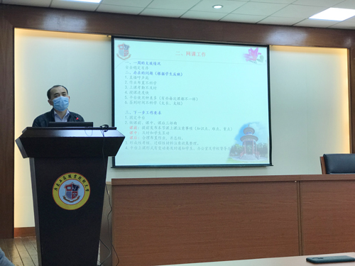 永利yl23411副院长王子飞从教学工作方面发言。首先他总结了永利yl23411第一周的网课工作安全稳定有序地进行着,同时指出网课中存在的如直播呼声高、平台使用规范性等诸多问题。并对网课工作作了下一步的要求,他希望任课教师能做到课前提前发布本节课上课注意事项、及时与学生互动、合理布置作业,注意收集整理网课资料等。