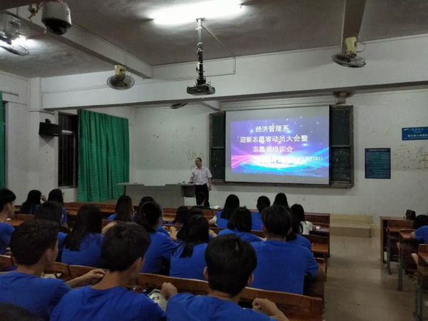 2018年9月12日晚上7:30分,经济管理系在载物楼104召开迎新志愿者动员大会暨培训大会,参加此次会议的有覃文进书记,洪春红副书记,刘晓敏老师,16以及17级全体迎新志愿者。会议由洪春红副书记主持。
